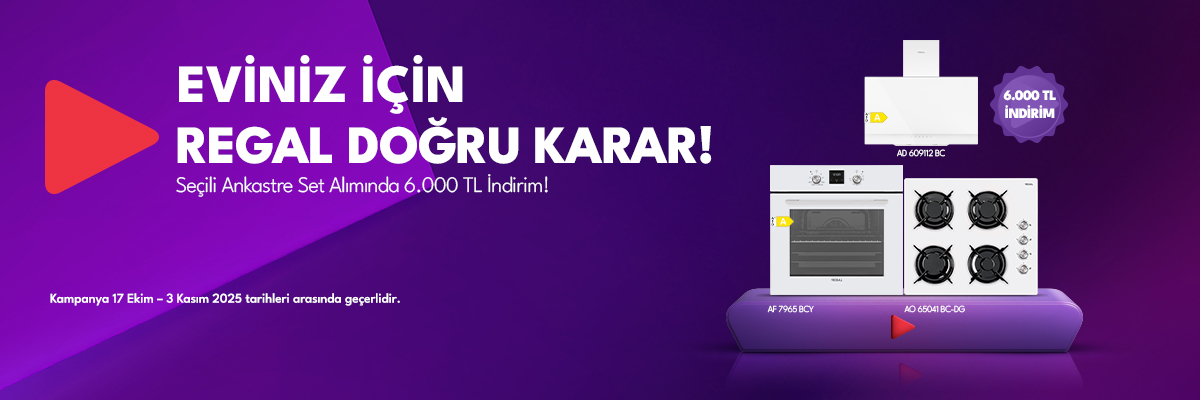 Kampanya 17 Ekim - 3 Kasım 2025 tarihleri arasında Regal Yetkili Satıcıları, Regal mağazaları ya da regal-tr.com’dan alınan seçili ürünlerde geçerlidir. Kampanya Regal Yetkili Satıcılarında ve regal-tr.com kurumsal internet sitesinde bulunan stoklarla sınırlıdır. Seçili Ankastre Fırın, Ankastre Davlumbaz, Ankastre Ocak kapsamında geçerlidir. Belirtilen ürün kategorilerinden farklı ürün grubundan olmak koşuluyla 3 ürün alımına sepette 6.000 TL indirim tanımlanacaktır. Fiyatlar Vestel Ticaret A.Ş. tarafından tavsiye edilen veya azami fiyatlar olup, sadece bilgi amaçlıdır ve bir fiyat teklifi niteliği arz etmez. Perakende satış fiyatları Regal Yetkili Satıcıları tarafından müstakil olarak belirlendiğinden yetkili satıcıların satış ve fiyat belirleme politikalarına göre farklılık gösterebilir. Kampanya, diğer paket kampanyalarla birleşemez, tekil ve online kampanyalar ile birleşebilir. Kampanyaya dahil ürünlerin kod listesi ve kampanya ayrıntıları regal-tr.com’dadır. Kodları listede olmayan ürünler kampanyaya dahil değildir. Kampanya şartlarını, kampanyaların geçerlilik tarihlerini ve kampanyalar dahilindeki ürünleri değiştirme, kampanyaları durdurma ve iptal etme hakkı Vestel Ticaret A.Ş.’ye aittir. Paket olarak alınan ürünlerden herhangi birini veya birkaçını iade etmesi halinde, tüketici katıldığı paket için yapılan indirim tutarını katılım yaptığı paket dahilinde geri ödemek durumundadır. Cayma hakkının kullanılması halinde tüketici ilgili kampanyadan faydalanamaz.