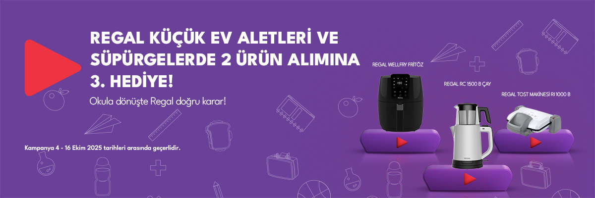 Kampanya 4-16 Ekim 2025 tarihleri arasında Regal Yetkili Satıcıları, Regal mağazaları ya da regal-tr.com’dan alınan seçili ürünlerde geçerlidir. Kampanya stoklarla sınırlı olup tüm Küçük Ev Aletleri ve Elektrikli Süpürge ürünlerinde 2 ürün alımına 3. ürün hediye olacaktır, stoklar toplamda 2.000 adetle sınırlıdır. Satın alınan üç üründen tavsiye edilen perakende fiyatı en düşük olan ürün ücretsiz verilecektir. Kampanyadan faydalanabilmek için sepetteki 3 ürünün birbirinden farklı kodda olması gerekmektedir. Uygulama kapsamında aynı üründen 1'den fazla alınamaz. Perakende satış fiyatları Regal Yetkili Satıcıları tarafından müstakil olarak belirlendiğinden yetkili satıcıların satış ve fiyat belirleme politikalarına göre farklılık gösterebilir. Kampanya, diğer paket kampanyalarla birleşemez, tekil ve online kampanyalar ile birleşebilir. Kampanyaya dahil ürünlerin kod listesi ve kampanya ayrıntıları regal-tr.com’dadır. Kodları listede olmayan ürünler kampanyaya dahil değildir. Kampanya şartlarını, kampanyaların geçerlilik tarihlerini ve kampanyalar dahilindeki ürünleri değiştirme, kampanyaları durdurma ve iptal etme hakkı Vestel Ticaret A.Ş.’ye aittir. Paket olarak alınan ürünlerden herhangi birini veya birkaçını iade etmesi halinde, tüketici katıldığı paket için yapılan indirim tutarını katılım yaptığı paket dahilinde geri ödemek durumundadır. Cayma hakkının kullanılması halinde tüketici ilgili kampanyadan faydalanamaz