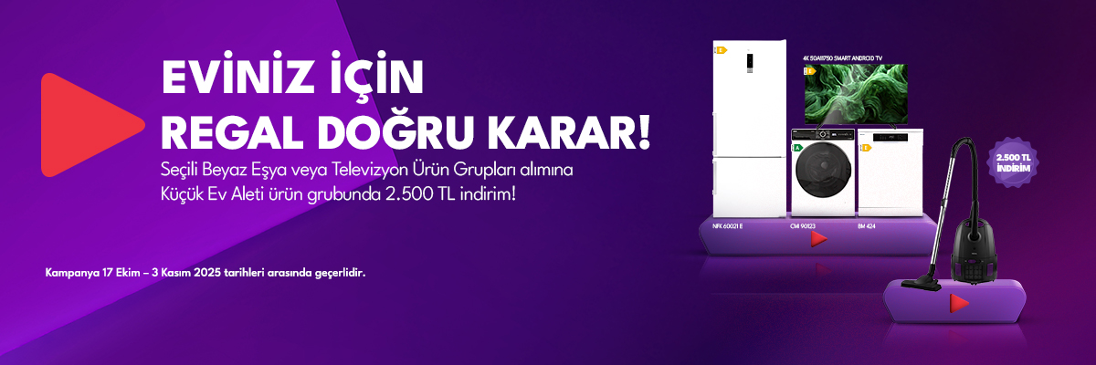 Kampanya 17 Ekim-3 Kasım 2025 tarihleri arasında Regal Yetkili Satıcıları, Regal mağazaları ya da regal-tr.com’dan alınan seçili ürünlerde geçerlidir. Kampanya Regal Yetkili Satıcılarında ve regal-tr.com kurumsal internet sitesinde bulunan stoklarla sınırlıdır. Seçili 43" ve üstü LCD Tv’ler, Seçili 520 litre ve üzeri NF, NFK, FD Buzdolapları, Seçili 7 kg ve üzeri Inverter Çamaşır Makineleri, Seçili Kurutma Makineleri, Seçili 3 program ve üstü Bulaşık Makineleri ve Ankastre Bulaşık Makineleri, Seçili 5 çekmece ve üzeri çekmeceli ve 150 litre üstü sandık tipi Derin Dondurucular, Seçili Solo Fırınlar, Seçili Ankastre Fırınlar ile birlikte Seçili Küçük Ev Aleti veya Süpürge ürünlerinden alımında 2.500 TL indirim tanımlanacaktır. Fiyatlar Vestel Ticaret A.Ş. tarafından tavsiye edilen veya azami fiyatlar olup, sadece bilgi amaçlıdır ve bir fiyat teklifi niteliği arz etmez. Perakende satış fiyatları Regal Yetkili Satıcıları tarafından müstakil olarak belirlendiğinden yetkili satıcıların satış ve fiyat belirleme politikalarına göre farklılık gösterebilir. Kampanya, diğer paket kampanyalarla birleşemez, tekil ve online kampanyalar ile birleşebilir. Kampanyaya dahil ürünlerin kod listesi ve kampanya ayrıntıları regal-tr.com’dadır. Kodları listede olmayan ürünler kampanyaya dahil değildir. Kampanya şartlarını, kampanyaların geçerlilik tarihlerini ve kampanyalar dahilindeki ürünleri değiştirme, kampanyaları durdurma ve iptal etme hakkı Vestel Ticaret A.Ş.’ye aittir. Paket olarak alınan ürünlerden herhangi birini veya birkaçını iade etmesi halinde, tüketici katıldığı paket için yapılan indirim tutarını katılım yaptığı paket dahilinde geri ödemek durumundadır. Cayma hakkının kullanılması halinde tüketici ilgili kampanyadan faydalanamaz.